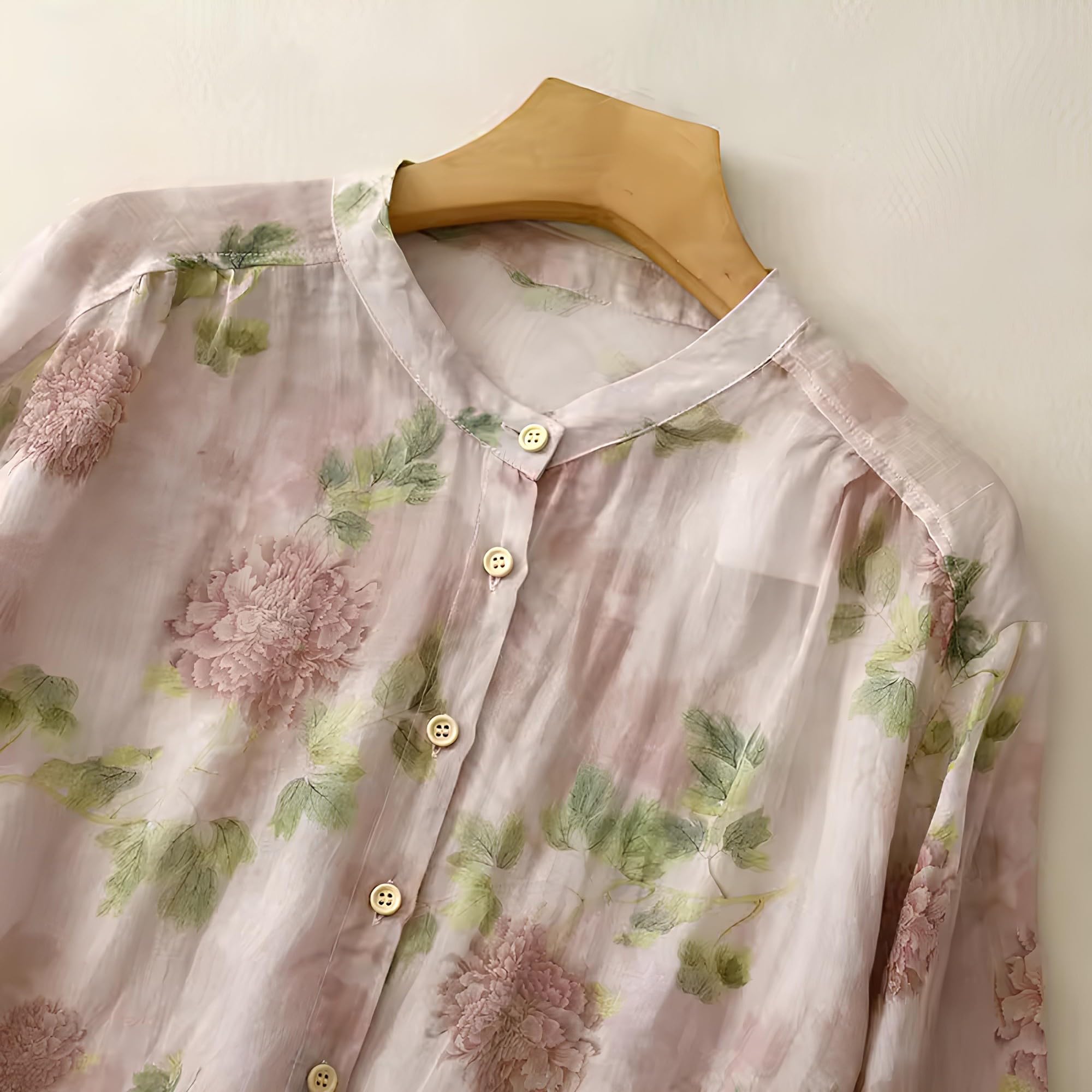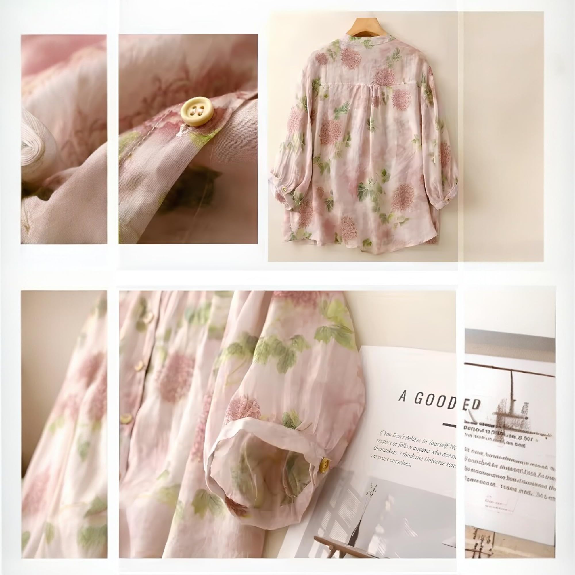 Gufrina Women’s Light Rose Floral Printed Button Down Shirt with Mandarin Collar and Relaxed Fit 3/4 Sleeves (Light Rose-XL)
